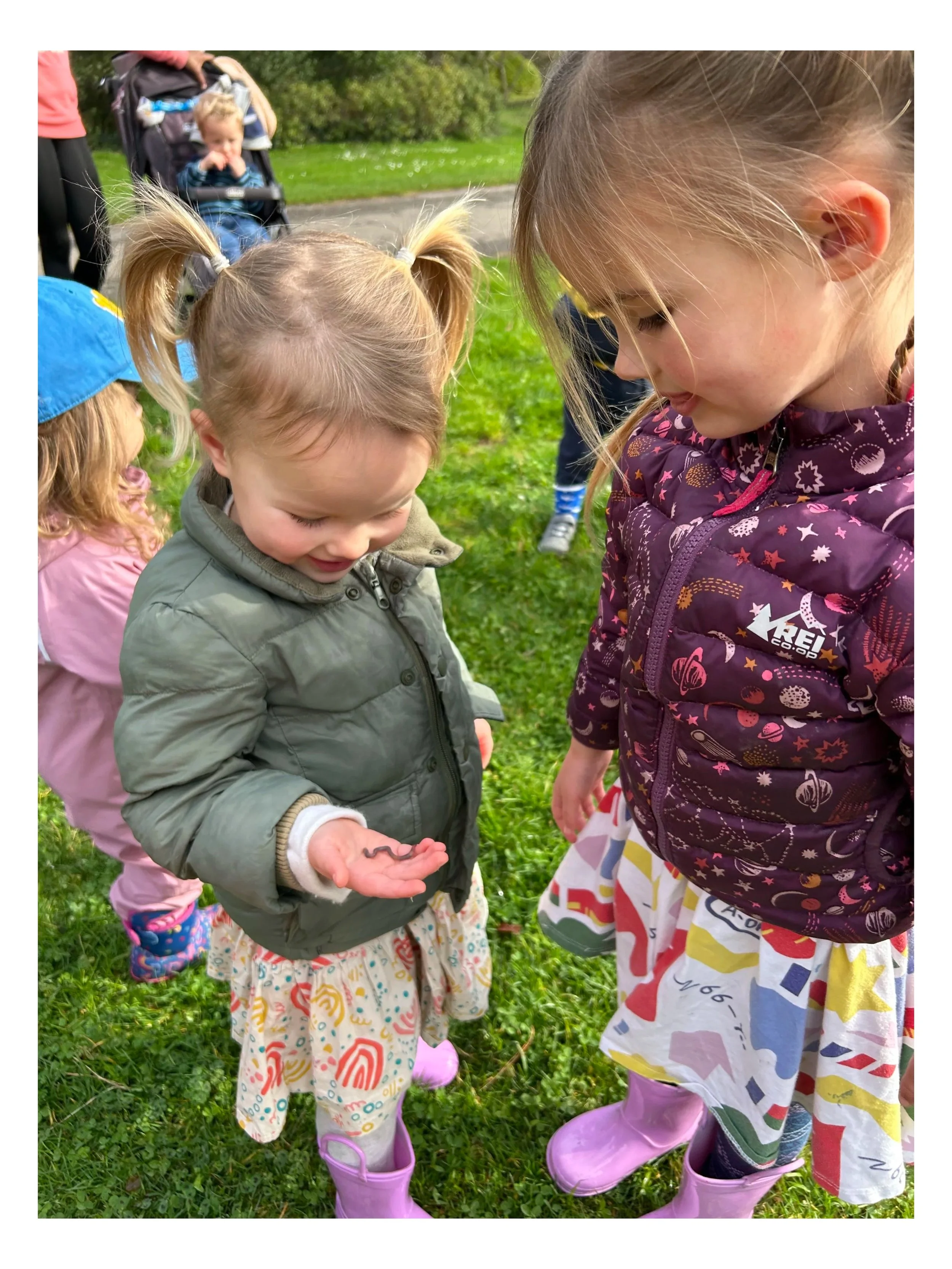 Opportunity to connect to nature in a meaningful way each week. Children will learn about and explore insects, worms, leaves and fauna, mud, sticks, trees and using nature in art!